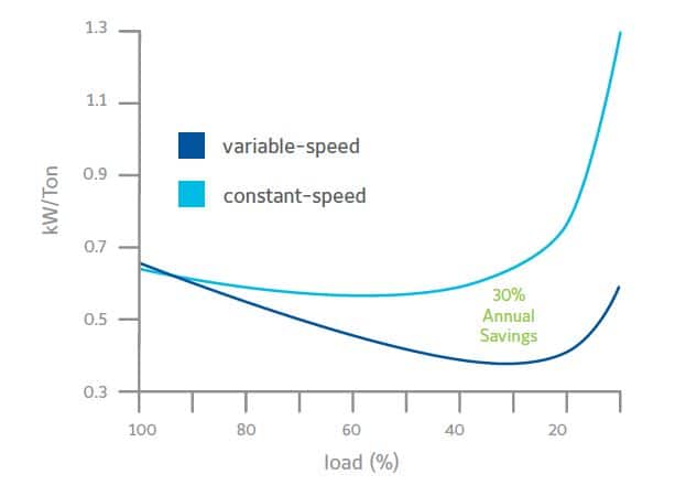 Variable speed drives (VSDs) can cut a chiller’s annual energy use by up to 30 percent while maintaining operating reliably over a wide range of condition. This is accomplished in two ways: