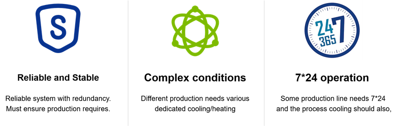 • Customized conditions. In different factory, various production line needs several dedicated cooling system and various application conditions. Deep dive into various factory conditions is needed to design the process cooling application.